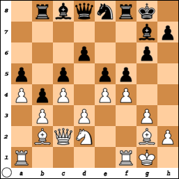 1.Nf3 c5 2.g3 Nc6 3.Bg2 g6 4.O-O Bg7 5.e4 d6 6.d3 Nf6 7.Nbd2 O-O 8.c3 e5 9.Ne1 b5 10.a4 b4 11.c4 Nd4 12.Nc2 Nxc2 13.Qxc2 Rb8 14.b3 a5 15.Bb2 Ne8 16.f4 f5