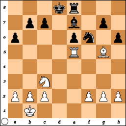 1.e4 e5 2.Bc4 d6 3.d3 c6 4.Nf3 f5 5.Bxg8 Rxg8 6.c3 Be7 7.Qb3 Rf8 8.h3 Qb6 9.Nbd2 Qxb3 10.axb3 Na6 11.b4 Nc7 12.c4 fxe4 13.Nxe4 h6 14.Bd2 Kf7 15.Bc3 Kg8 16.O-O-O Bf5