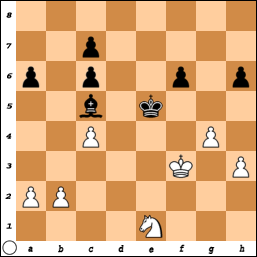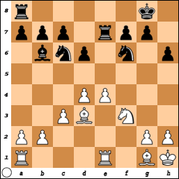 1.e3 e5 2.e4 Bc5 3.d3 d6 4.c3 h6 5.f4 exf4 6.Bxf4 Nf6 7.Nf3 Nc6 8.d4 Bb6 9.Bd3 O-O 10.O-O Re8 11.Re1 Bg4 12.Nbd2 Nh5 13.Be3 Qf6 14.Kh1 Bxf3 15.Qxf3 Qxf3 16.Nxf3 Nf6 17.Bg1 Re7