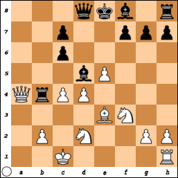 1.e3 e5 2.e4 Nf6 3.d3 d5 4.f4 Nc6 5.fxe5 Ng4 6.d4 dxe4 7.Bb5 e3 8.Nf3 Nf2 9.Qe2 Nxh1 10.Bxe3 a6 11.Bxc6+ bxc6 12.Nbd2 Rb8 13.O-O-O Be6 14.Rxh1 Bxa2 15.Qxa6 Bd5 16.c4 Rb6 17.Qa4 Rb4