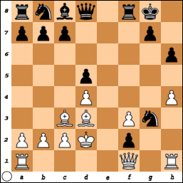 1.e3 d6 2.e4 Nf6 3.d3 g6 4.f4 Bg7 5.Nf3 Bg4 6.Be2 Nc6 7.O-O Qd7 8.c3 Bxf3 9.Bxf3 e5 10.a4 a5 11.Na3 h5 12.Nc4 O-O-O 13.f5 gxf5 14.exf5 Kb8 15.Bg5 d5 16.Bxf6 Bxf6 17.Ne3 Ne7