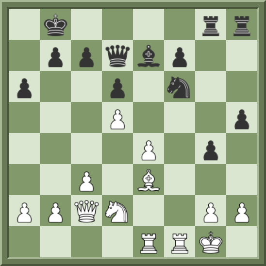 1.e3 e5 2.e4 Nf6 3.d3 d5 4.f4 Nc6 5.fxe5 Nxe5 6.d4 Ng6 7.e5 Ne4 8.Nf3 Bg4 9.Bd3 Bxf3 10.Qxf3 Qh4+ 11.g3 Qe7 12.O-O O-O-O 13.Nc3 Nxc3 14.bxc3 f6 15.exf6 gxf6 16.Qxf6 Qxf6 17.Rxf6 Bg7 18.Rf7 Rhg8 19.Bg5 Rdf8